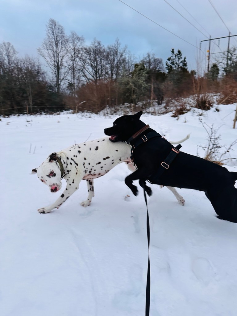 Månadens sista dag bjöd på ett fantastiskt väder. Sol, snö och härligt krispigt i luften. Vi passade på att ta en långpromenad i skogen med hundarna. Det gav helt klart energi både till oss och till hundarna. Vi har inte varit bortskämda med sol under januari, så det märks direkt att batterierna naturligt laddas på när man väl får solsken i ansiktet.